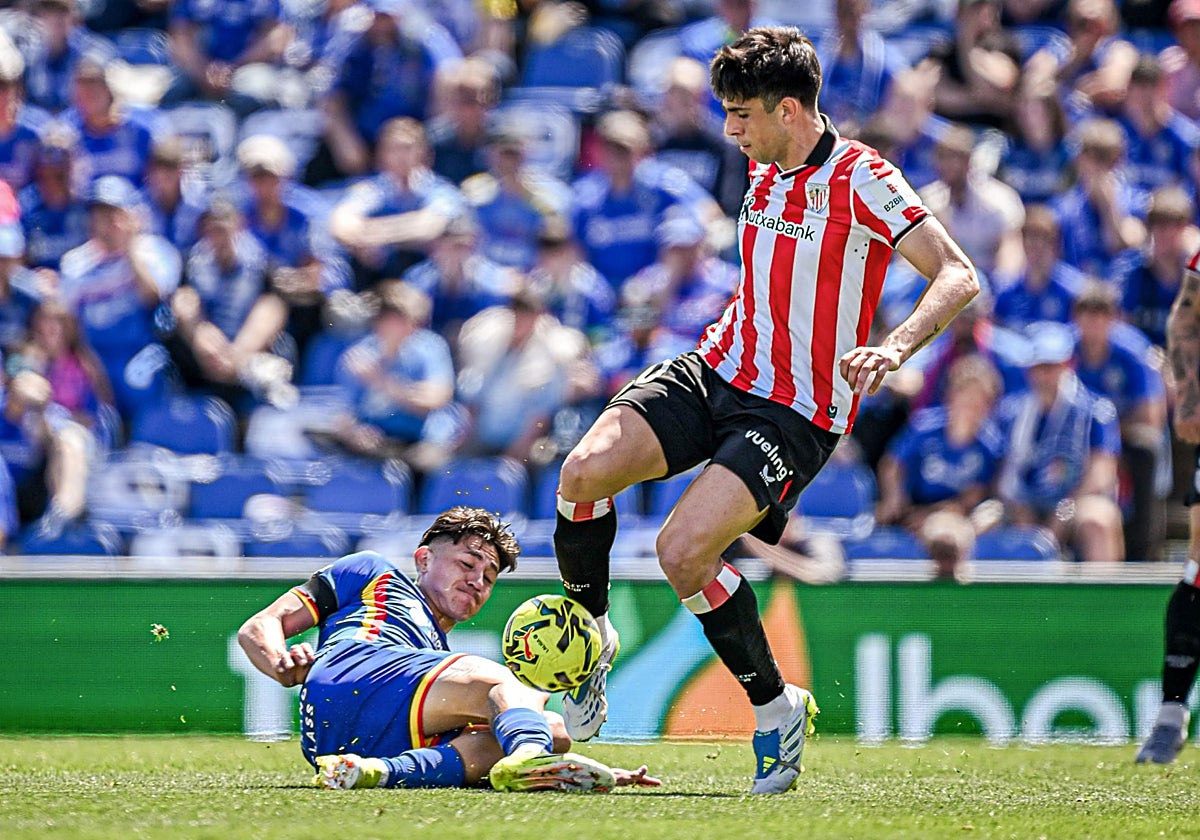 | Rego trata de recuperar el balón en una disputa con un jugador rival. EFE elcorreo.com/athletic/ jon-rivas-tomadura-pelo |